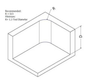 Vì dụng cụ cắt có dạng hình trụ nên không thể gia công các góc bên trong 90° hoàn hảo. Cách duy nhất để đạt được điều này là thông qua gia công điện cực EDM (Electrical Discharge Machining) (4), đây là quy trình sản xuất với chi phí cao hơn nhiều so với gia công máy CNC. Nên bo tròn tất cả các cạnh bên trong thiết kế của mình vì điều này sẽ giúp tiết kiệm thời gian đồng thời tránh tạo ra các cạnh sắc bén. Cũng nên sử dụng bán kính có kích thước đủ lớn, ít nhất bằng 1/3 độ sâu của khoang. Bán kính góc nhỏ sẽ yêu cầu một dụng cụ có đường kính nhỏ và vì dụng cụ nhỏ không thể loại bỏ một lượng lớn vật liệu trong một lần gia công nên sẽ cần nhiều lần gia công với tốc độ chậm hơn, do đó sẽ làm tăng thời gian và chi phí gia công. (4) Gia công điện cực EDM: là một quá trình sản xuất trừ dựa trên nhiệt. Nó chuyển đổi dòng điện thành năng lượng làm tan chảy hoặc làm bay hơi vật liệu dư thừa từ phôi. Quá trình này xử lý sự xói mòn để tạo ra các vết cắt và hình dạng như mong muốn từ nguyên liệu thô.