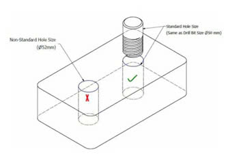 Khi thiết kế lỗ khoan, hãy sử dụng kích thước mũi khoan tiêu chuẩn. Kích thước lỗ khoan không chuẩn sẽ yêu cầu máy phay để hoàn thiện theo kích thước không chuẩn đã chỉ định, khiến cho thời gian gia công tăng cao.