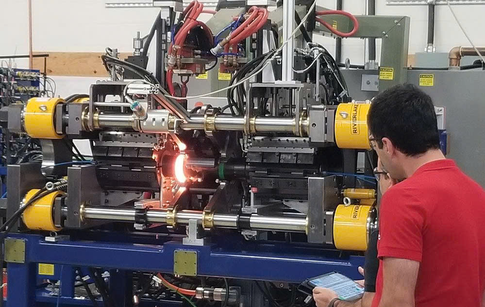 Một nhân viên (thuộc công ty SORSYS) đang trình bày công nghệ FuseRing hàn ma sát cảm ứng nhiệt, trên ống có đường kính ngoài 114 mm.