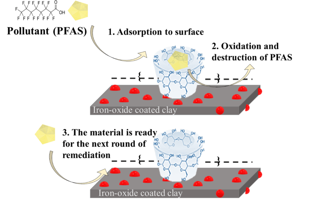 Các vật liệu tổng hợp đất sét-sắt-polymer hoạt động như máy gia tốc giam giữ PFAS trên bề mặt và sau đó đẩy nhanh quá trình oxy hóa phá hủy các chất ô nhiễm thành các chất không độc hại (ion florua, nước và carbon dioxide). Sự kết hợp này loại bỏ PFAS một cách hiệu quả và không giải phóng các chất không mong muốn trong nước dùng để uống.