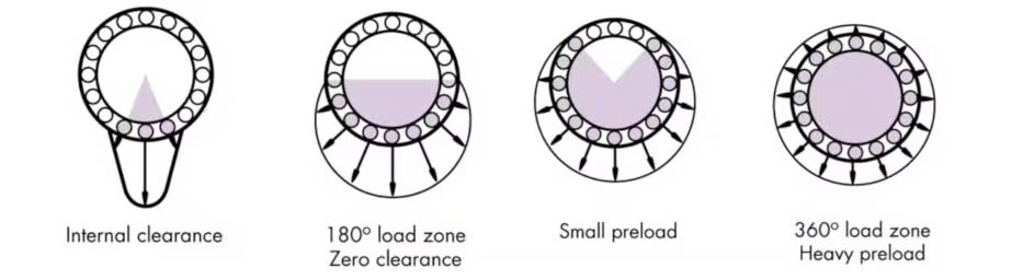 Để giải thích rõ hơn về tải trước, điều quan trọng là phải hiểu những gì đang diễn ra bên trong ổ trục khi lắp đặt chuyển từ độ rơ cuối sang tải trước. Vùng tải là tỷ lệ phần trăm các vòng bi tiếp xúc với cả hai rãnh lăn được thể hiện theo độ (~0° đến 360°).