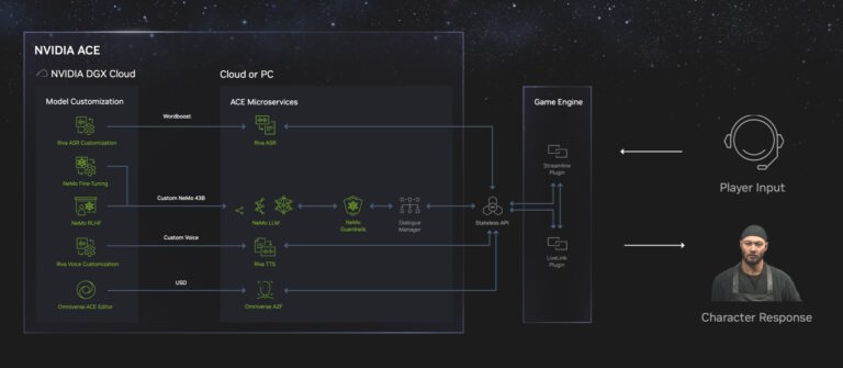 NVIDIA ACE cho lĩnh vực game bao gồm các mô hình nền tảng AI như NVIDIA Riva để phát hiện và ghi âm lời nói của người chơi. Văn bản sẽ kích hoạt NVIDIA NeMo để tạo ra các phản ứng tùy chỉnh được hoạt hình bằng NVIDIA Omniverse Audio2Face.