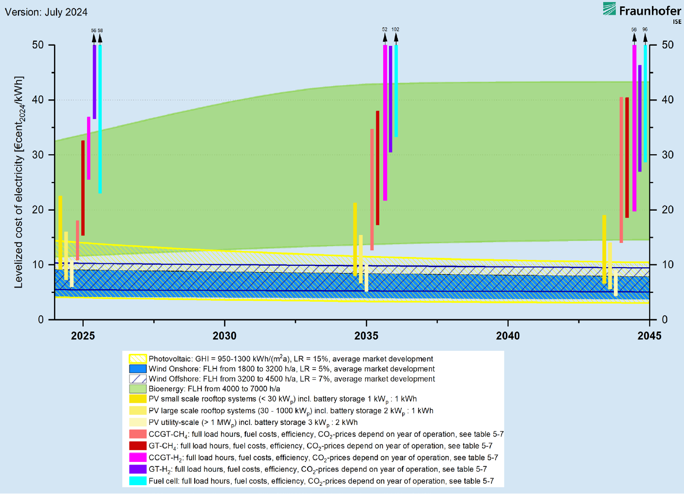 Như chúng tôi đã dự đoán trong các phân tích vào năm 2010, chi phí điện san bằng của PV và gió đã giảm đáng kể trong mười đến hai mươi năm qua. Theo thời gian, chúng tôi đã thêm các công nghệ như hệ thống lưu trữ pin vào các phân tích của mình. Trong thông báo mới nhất, chúng tôi đã đưa thêm các công nghệ như tua-bin khí hydro, được thiết lập để đóng vai trò quan trọng trong mười đến 15 năm tới tại công viên nhà máy điện của CHLB Đức.