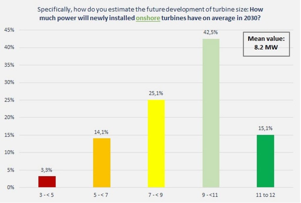 Câu hỏi về kích thước tuabin và sản lượng điện dự kiến cho năm 2030 cho cả phân đoạn trên bờ và ngoài khơi, lần đầu tiên được đưa vào khảo sát WEtix này, đề cập đến tiềm năng tiến bộ công nghệ hơn nữa. Đối với cả hai phân khúc, những người được hỏi bày tỏ kỳ vọng về mức tăng ít nhiều đáng kể của công suất đầu ra của tuabin, bất chấp ý kiến chung của các chuyên gia trong ngành rằng mức tăng trưởng là hữu hạn. Điều này là do hy vọng rằng các nhà sản xuất tuabin cuối cùng sẽ bước vào vùng có lãi, đây là điều cần thiết trong dài hạn. Công suất trung bình 18,8 MW đối với các tua-bin ngoài khơi và 8,2 MW đối với các tua-bin trên bờ sẽ thể hiện mức tăng thêm đáng kể.