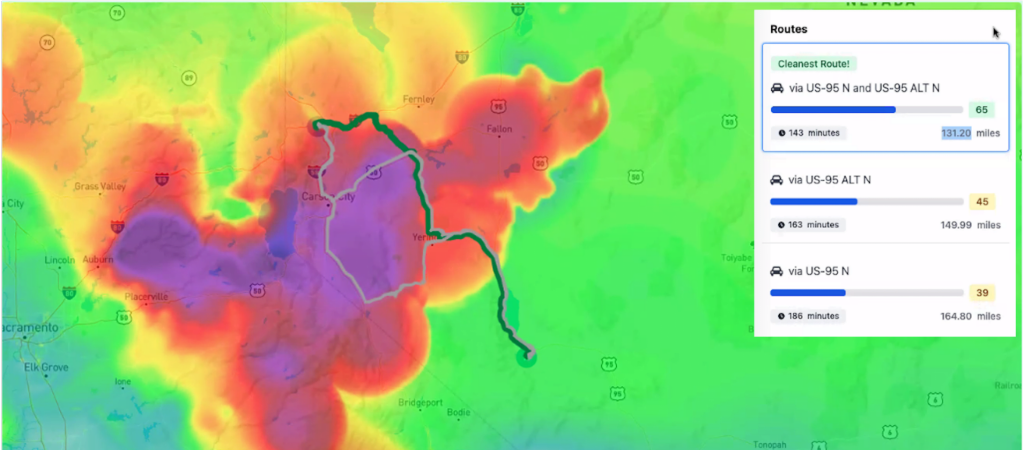 Tính năng Tuyến đường sạch nhất (Cleanest Route) của nó sẽ gợi ý tuyến đường ít ô nhiễm nhất, không chỉ cho người đi bộ và người đi xe đạp mà còn cho những người lái xe ô tô, những người thực sự tiếp xúc với mức độ ô nhiễm cao hơn khi họ ngồi sau tay lái. BreezoMeter phân tích các tuyến đường đi bộ hoặc lái xe riêng lẻ và cho điểm từ 0 đến 100, dựa trên các thước đo về ô nhiễm không khí, bụi phấn hoa và khói.