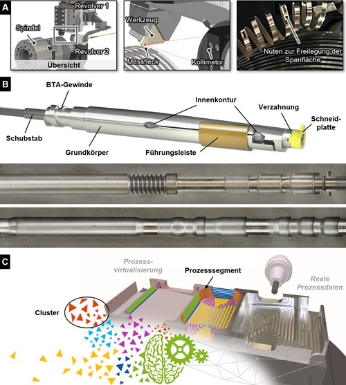 Các lĩnh vực nghiên cứu tại Viện ISF: Xác định nhiệt độ bề mặt cắt trong quá trình vận hành (A), triển khai các lỗ khoan nhỏ hơn ngay cả ở độ sâu lớn (B) và dự đoán hành vi quy trình dựa trên mô phỏng (C).
