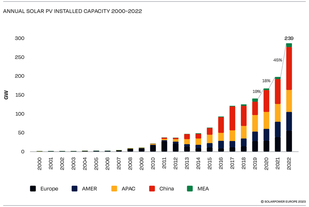 Triển vọng thị trường toàn cầu hàng năm mới nhất của SolarPower Châu Âu báo cáo một thập kỷ thế giới phá vỡ kỷ lục lắp đặt năng lượng mặt trời của chính mình hàng năm. Thế giới đã lắp đặt 239 GW năng lượng mặt trời mới vào năm 2022, tăng 45% so với năm 2021.