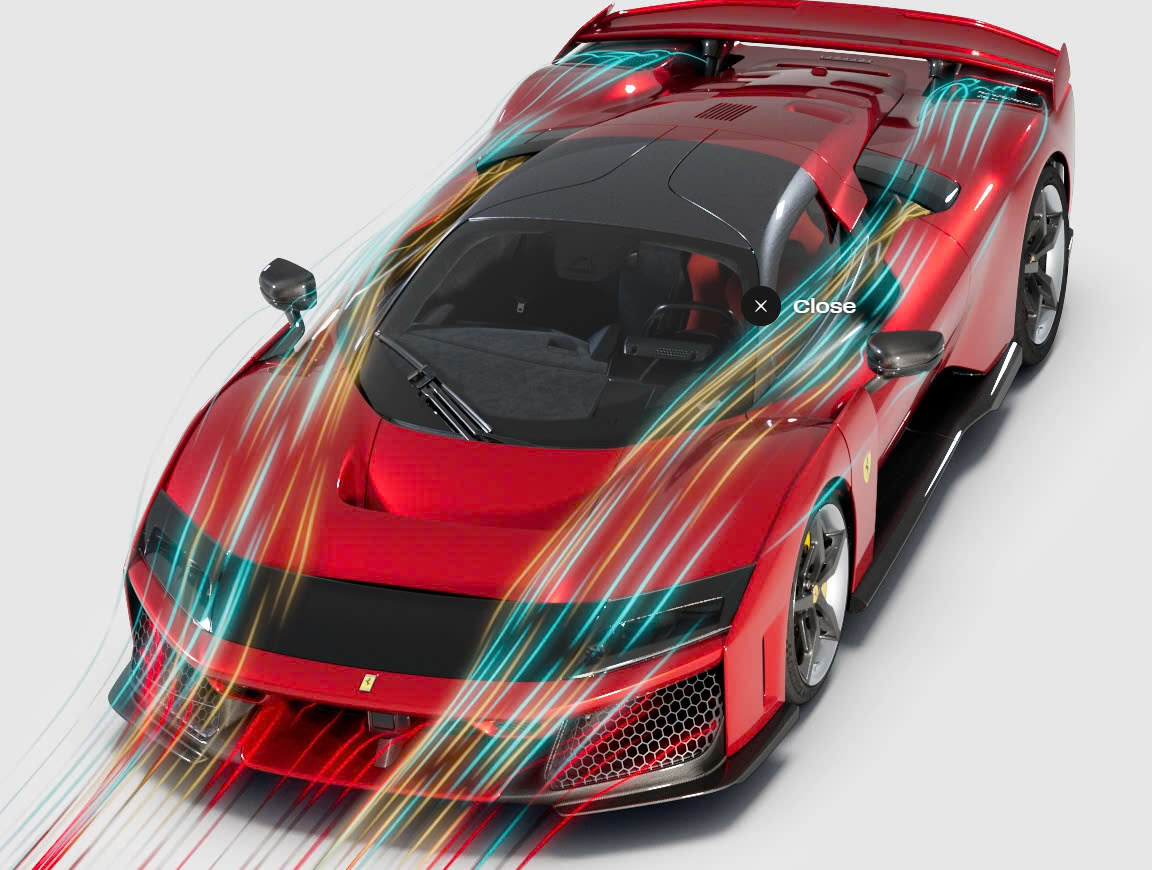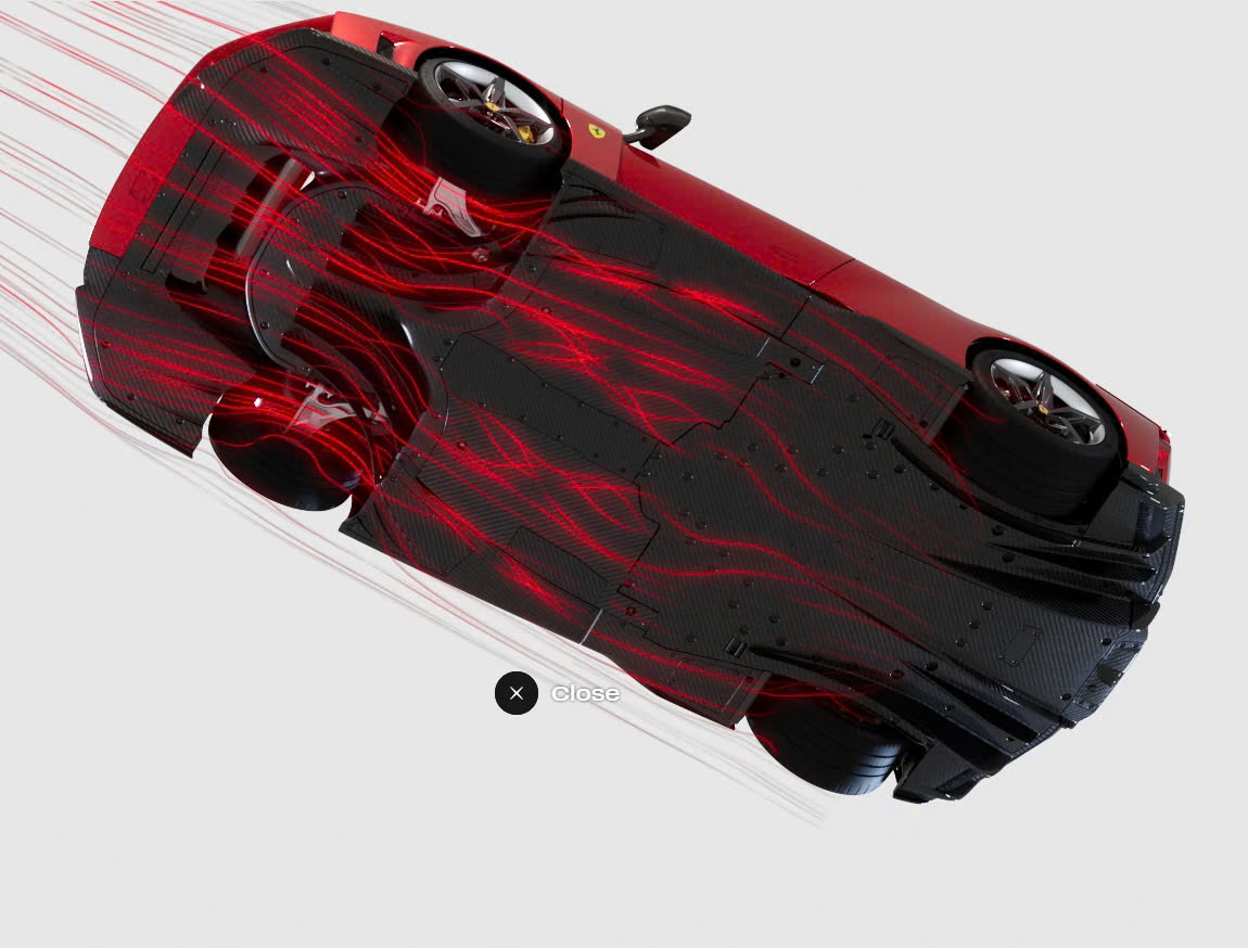 Xe F80 đẩy hiệu suất khí động học lên mức cao nhất đối với một chiếc xe Ferrari đường trường, như được chứng minh bằng lực ép xuống 1.000 kg được tạo ra ở tốc độ 250 km/h. Thành tựu đáng kinh ngạc này có thể thực hiện được nhờ sự cộng tác hoàn hảo giữa tất cả các bộ phận của công ty Ferrari đang làm việc để định hình thiết kế của xe; đối với mỗi phòng ban, sự cân bằng hoàn hảo giữa lực ép xuống và tốc độ tối đa là cơ sở cho mọi lựa chọn thiết kế, tạo nên một bộ giải pháp hoàn hảo phù hợp với một siêu xe thực thụ.