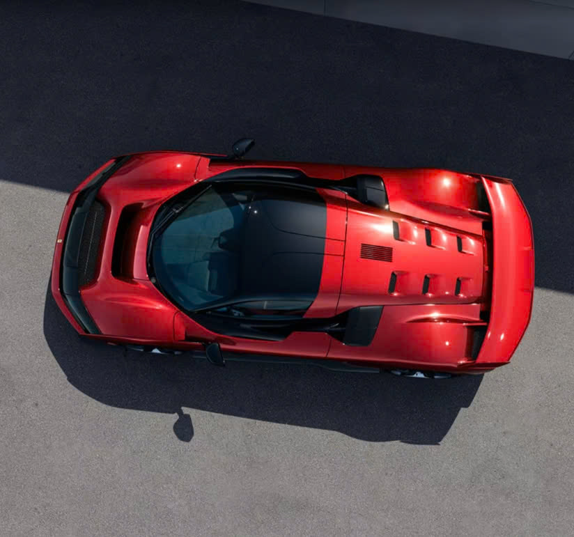 Với cánh gió sau xe được nâng lên, thể hiện sức mạnh và sự năng động hơn nữa khi sự khác biệt về cân bằng thị giác giữa hai cấu hình cho thấy mặt khác của tính cách. Các nhu cầu chức năng của chiếc xe đã được giải quyết về mặt trực quan trong thiết kế để tạo ra sự cân đối hoàn hảo giữa hiệu suất và hình thức. Một số tính năng đóng vai trò rất quan trọng trong việc xác định đặc tính của xe: ống dẫn NACA dẫn không khí về phía cửa hút gió động cơ và bộ tản nhiệt bên hông, mang tính biểu tượng cũng như tính chức năng của nó và tạo nên một trong những kiểu dáng độc đáo nhất của hông xe.