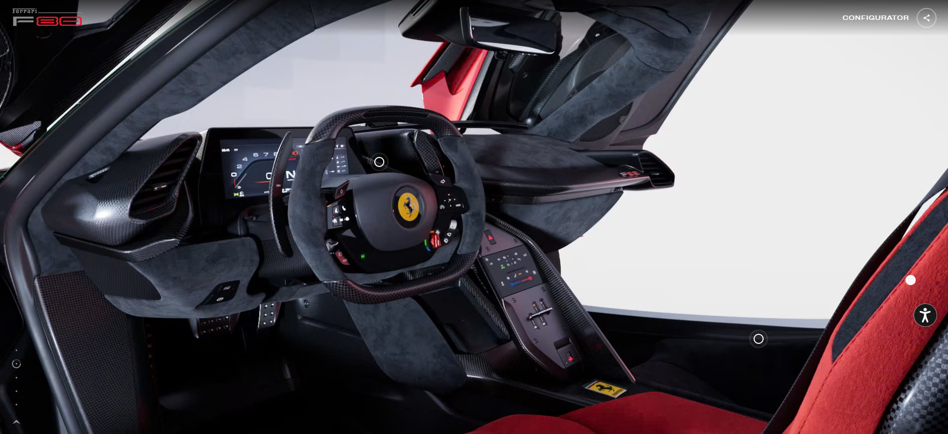 Xe F80 tự hào với vô lăng được phát triển dành riêng cho xe này, sẽ xuất hiện trên các mẫu xe chạy trên đường trường trong tương lai của công ty Ferrari. Nhỏ hơn một chút so với người tiền nhiệm và có vành trên và dưới phẳng, vô lăng cũng có một gờ nhỏ hơn, cải thiện tầm nhìn và làm nổi bật cảm giác thể thao khi lái xe. Các vùng bên của vành được tối ưu hóa để đảm bảo độ bám tốt hơn khi có hoặc không có găng tay. Các nút bấm vật lý trên nan hoa bên phải và bên trái của vô lăng đã trở lại ở đây, thay thế bố cục kỹ thuật số hoàn toàn mà Ferrari sử dụng trong những năm gần đây bằng một giải pháp với các nút cơ dễ sử dụng hơn, có thể được xác định ngay lập tức bằng cách chạm.