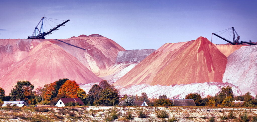 Núi muối màu đỏ từ nhiều thập kỷ khai thác kali tại Soligorsk, Belarus.