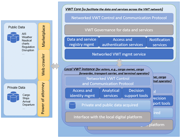 Mặc dù giấy ủy quyền tạo điều kiện thuận lợi cho việc chia sẻ dữ liệu riêng tư trên mạng lưới VWTnet, nhưng điều sau đây cho phép chia sẻ dữ liệu công khai và quyền truy cập vào các dịch vụ phân tích dữ liệu. – Mỗi thành viên VWT sẽ được đăng ký làm phiên bản VWT cục bộ do VWT quản lý; các thành viên bao gồm chủ hàng, người giao nhận, người vận chuyển, người điều hành thiết bị đầu cuối và nhà cung cấp dữ liệu và dịch vụ phân tích. – Cả dữ liệu miễn phí/ tính phí và dịch vụ phân tích cũng như giao diện lập trình của chúng như API và URI cũng sẽ được VWT đăng ký và quản lý. – VWT quản lý sổ đăng ký dữ liệu và dịch vụ phân tích, quyền truy cập và xác thực của các phiên bản VWT riêng lẻ cũng như kết nối giữa các phiên bản VWT. – VWTnet sẽ tạo điều kiện thuận lợi cho việc tiếp cận và truy cập vào dữ liệu công cộng và các dịch vụ phân tích dữ liệu do từng đơn vị cung cấp. – VWT có thể sử dụng chương trình thu thập dữ liệu web để thu thập thông tin công khai miễn phí, chẳng hạn như dữ liệu mang mục đích cung cấp thông tin, thông báo và cảnh báo cho các VWT địa phương.