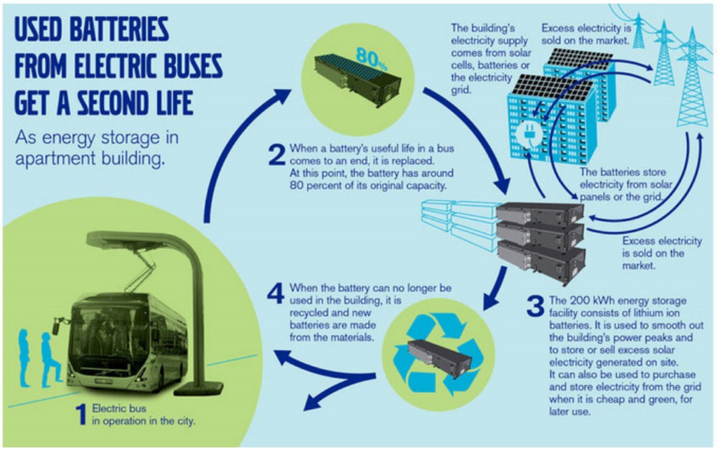 Hãng ô tô Volvo đã (Thụy Điển) lên kế hoạch tái chế pin đã sử dụng của xe buýt điện bằng cách đặt pin trong máy quang điện, để tích trữ năng lượng mặt trời, và kết nối với mạng lưới điện khi cần thiết.