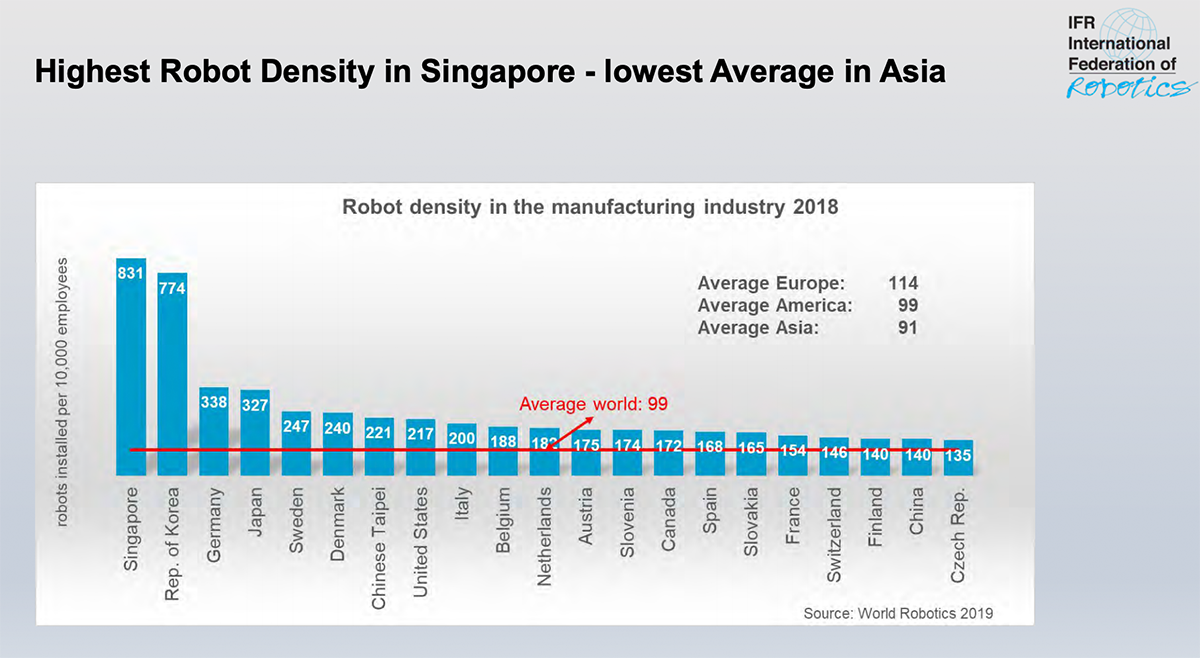 Đứng sau hai quốc gia ở vị trí dẫn đầu là Singapore và Hàn Quốc, CHLB Đức có mật độ robot là 338 robot trên 10.000 công nhân, đứng ở vị trí thứ ba trên toàn thế giới. Ông Junji Tsuda, Chủ tịch Liên đoàn IFR cho biết: “Mật độ robot là một tiêu chuẩn để so sánh mức độ tự động hóa của ngành công nghiệp sản xuất của mỗi quốc gia”. Số lượng robot công nghiệp được mua tại CHLB Đức vào năm 2018 đã tăng 26%, gần 27.000 robot, là một mức kỷ lục. Cho đến nay, có thể thấy nhu cầu sử dụng robot lớn nhất đến từ ngành công nghiệp ô tô.