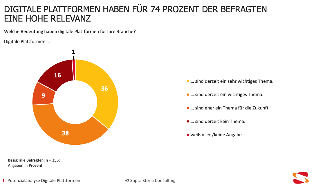 Để phân tích tiềm năng của các nền tảng kỹ thuật số, một cuộc khảo sát đã được tiến hành, 355 nhà lãnh đạo và chuyên gia thuộc các lĩnh vực khác nhau, như cung cấp năng lượng hay ô tô đã được phỏng vấn. Kết quả cho thấy, 59% trong số đó cho biết họ không xem kỹ thuật số là một mối đe dọa đến hoạt động kinh doanh của công ty; 73% thậm chí nghĩ rằng việc tham gia vào các nền tảng này hoặc thiết lập nền tảng cho riêng mình để phát triển mô hình kinh doanh mới là vô cùng hợp lý. Trong đó, có khoảng 60% mong muốn phát triển thị trường mới theo phương thức này. Cuộc khảo sát cũng cho thấy ngành công nghiệp sản xuất ít lo ngại về vấn đề nền tảng kỹ thuật số hơn các ngành khác. Họ tin rằng khó có yếu tố nào có thể ảnh hưởng hay thay thế các hoạt động của ngành công nghiệp. Tuy nhiên, có đến ba trong số bốn ngân hàng và những công ty bảo hiểm cho rằng các hoạt động kinh doanh của họ đang bị đe dọa bởi sự xuất hiện của nền tảng kỹ thuật số.