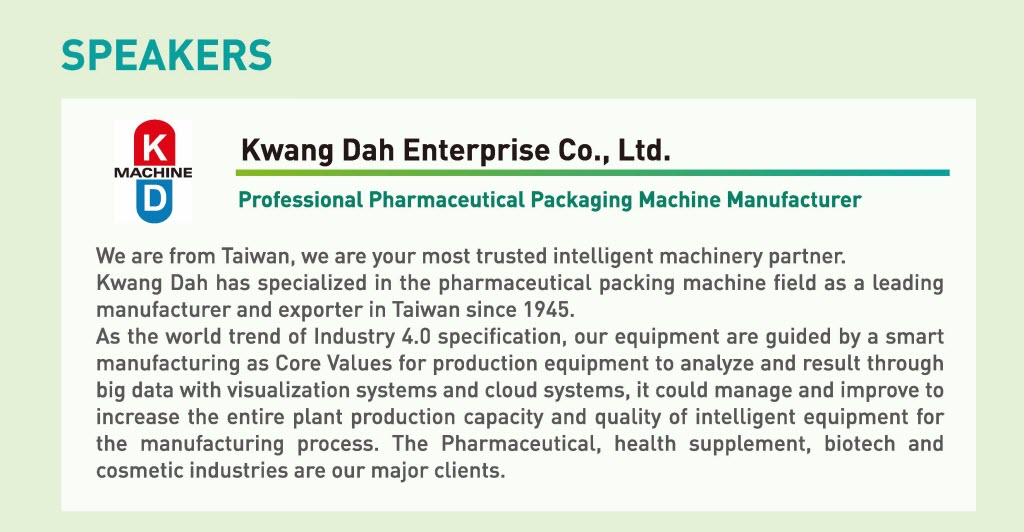Kwang Dah Enterprise là công ty Đài Loan, là nhà cung cấp giải pháp máy móc thông minh đáng tin cậy. Kwang Dah Enterprise chuyên trong lĩnh vực máy đóng gói dược phẩm, là sản xuất và xuất khẩu hàng đầu hàng đầu Đài Loan từ năm 1945.