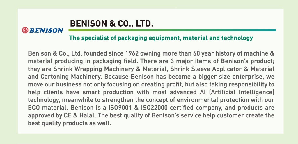 Được thành lập năm 1962, công ty Benison có hơn 60 năm kinh nghiệm sản xuất máy móc và vật liệu trong lĩnh vực đóng gói. Benison có 3 dòng sản phẩm chính: Máy đóng gói màng co và nguyên vật liệu, Shrink Sleeve Applicator & Material, và máy đóng thùng carton.