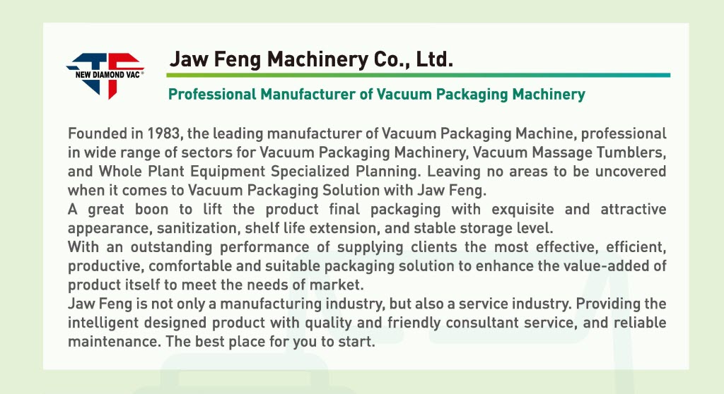 Được thành lập vào năm 1983, Jaw Feng Machinery là nhà sản xuất hàng đầu về máy đóng gói chân không. Công ty có chuyên môn và kinh nghiệm dày dạn trong lĩnh vực về máy đóng gói chân không, máy hút chân không, và lập kế hoạch về trang thiết bị chuyên ngành cho toàn bộ nhà máy. Giải pháp đóng gói chân không của Jaw Feng Machinery, bao bì sẽ không còn bất kỳ khoảng không khí nào ở trong. Một giải pháp tuyệt vời để nâng cao chất lượng bao bì sản phẩm với sự tinh tế, hấp dẫn, vệ sinh, bảo quản tốt sản phẩm bên trong và mức độ lưu trữ ổn định.