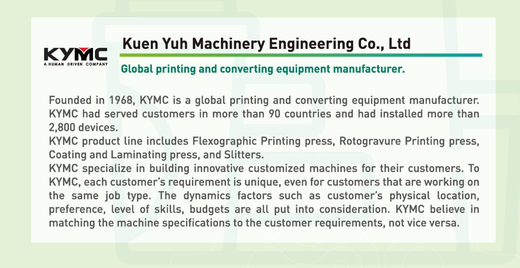 Được thành lập vào năm 1968, KYMC là nhà sản xuất thiết bị in ấn và chuyển đổi trang thiết bị toàn cầu. KYMC đã phục vụ khách hàng tại hơn 90 quốc gia và đã lắp đặt hơn 2.800 thiết bị. Dòng sản phẩm của KYMC bao gồm máy in Flexographic, máy in Rotogravure, máy ép phủ và ép, và Slitters.