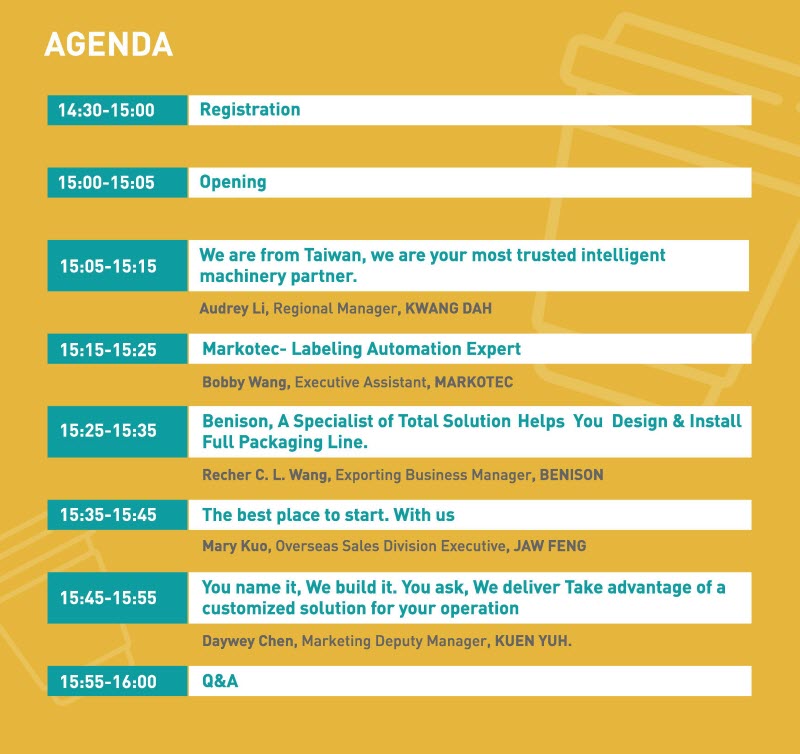Chủ đề và các công ty tham dự thuyết trình bao gồm: 1. Kwang Dah Enterprise Co., Ltd – Professional Pharmaceutical Packaging Machine Manufacturer 2. Markotec Great John Machinery Co., Ltd – Labeler Leader in Labelling Automation 3. Benison & Co., Ltd – The specialist of packaging equipment, material, and technology 4. Jaw Feng Machinery Co., Ltd – Professional Manufacturer of Vacuum Packaging Machinery 5. Kuen Yuh Machinery Engineering Co., Ltd – Global printing and converting equipment manufacturer