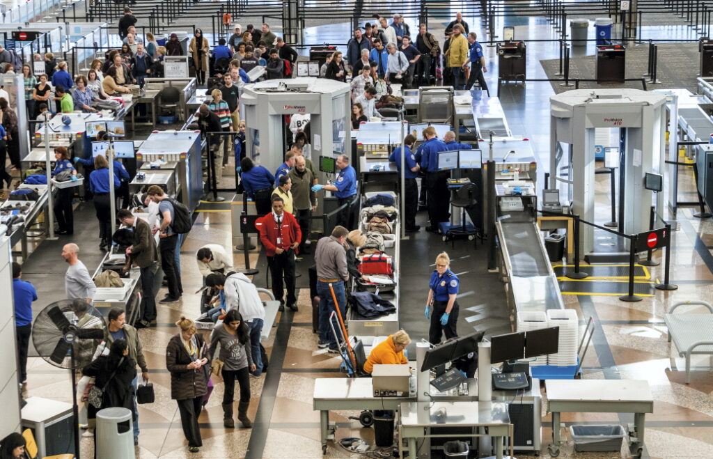 Hành khách xếp hàng chờ kiểm tra hành lý tại sân bay quốc tế Denver, Hoa Kỳ.