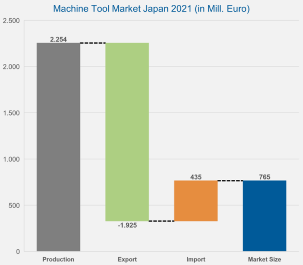 Tổng khối lượng của thị trường máy công cụ Nhật Bản vào năm 2021 là khoảng 2,9 tỷ euro, thấp hơn so với năm trước (âm 8%). Xét theo nhóm máy riêng lẻ, thị trường máy tiện và máy gia công trung tâm tiện (khoảng 715 triệu euro) là lớn nhất, tiếp theo là máy laser (khoảng 581 triệu euro) và máy ép tạo hình (khoảng 467 triệu euro).