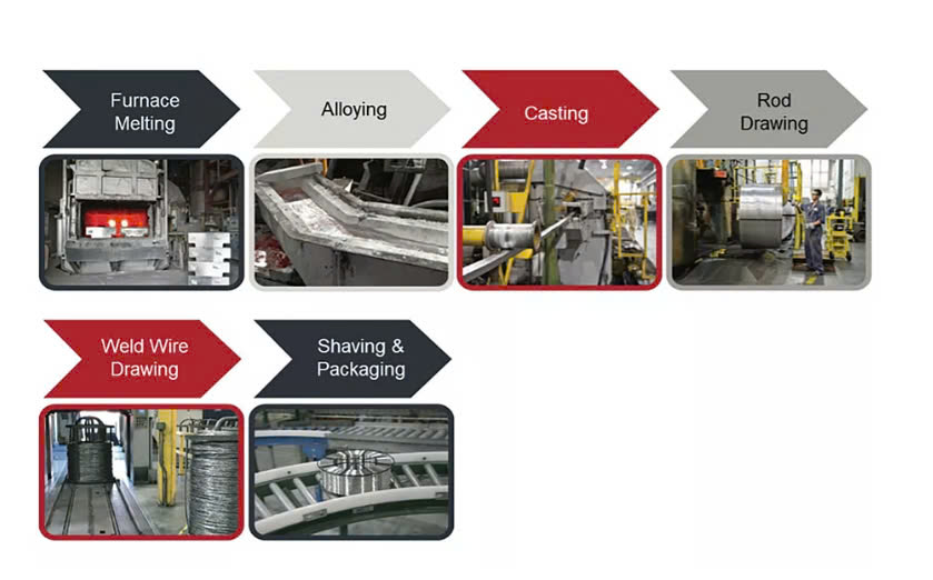 Biểu đồ hiển thị các quy trình sản xuất dây hàn nhôm: nung chảy trong lò, tạo hợp kim, đúc, kéo thanh, kéo dây hàn, bào và đóng gói