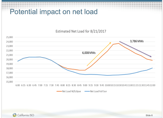 California hiện đang nắm giữ gần nửa công suất năng lượng Mặt Trời của cả quốc gia. Trong 5 năm qua, California đã tăng tầm ảnh hưởng của mình từ 0,4% lên 10%, thông số có từ báo cáo của Ban Điều hành Thông tin Năng lượng Hoa Kỳ. Vào ngày 21 tháng 8 tới, con số ấy sẽ tương đương với sự thiếu hụt khoảng 6.000 megawatt khi hiện tượng nhật thực dự kiến kéo dài vài giờ đồng hồ diễn ra. Để dễ so sánh, thì 6.000 MW là đủ để cung cấp năng lượng cho một thành phố lớn.