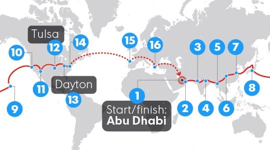 Độc giả sẽ thấy rõ hơn hành trình 12 chặng bay đã qua trong bản đồ đường bay từ nơi xuất phát (thành phố Abu Dhabi) và cũng sẽ là nơi kết thúc chuyến bay dưới đây: