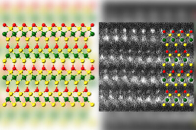 Sơ đồ cho thấy các lớp phân tử bán dẫn (xanh lá cây và vàng) và nguyên tử coban (đỏ) được tạo ra bằng phương pháp của đại học UCLA, cùng với hình ảnh kính hiển vi điện tử lập bản đồ các nguyên tử của vật liệu mới