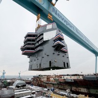 Các kỹ sư đang hạ miếng ghép cấu trúc cuối cùng của tàu USS Gerald R. Ford