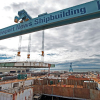 Cần trục cỡ lớn Big Blue tại xưởng đóng tàu Newport News Shipbuilding trong quá trình đóng tàu