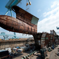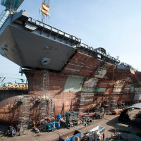 Việc lắp ghép phần dưới mũi tàu (có trọng lượng khoảng 680 tấn) và phần trên mũi tàu (787 tấn) vào sống tàu là một công đoạn đòi hỏi sự chính xác rất cao.