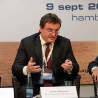 Từ trái sang, bà Signe Bruun Jensen – Giám đốc phát triển bền vững Maersk Line, ông Poul Woodall – Giám đốc bộ phận môi trường công ty DFDS A/S, ông Laran Wetemans – Tổng Giám đốc Shell LNG, ông Günter Eiermann – Giám đốc kỹ thuật công ty Bomin Linde GmbH, ông Ruediger Pallentin – Hội đồng quản trị công ty Lloyd Werft Bremerhaven AG và ông Matt Frei – người điều hành buổi thảo luận