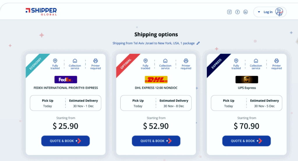 Công ty Shipper Global đưa ra mức giá thấp nhất ($25,90 chẳng hạn cho một bưu kiện từ Tel Aviv đến New York), giá nhanh nhất ($70,90) và giá tối ưu ($52,90).