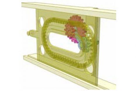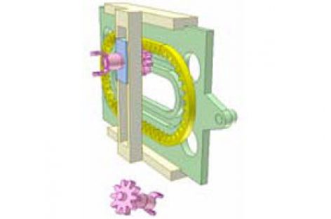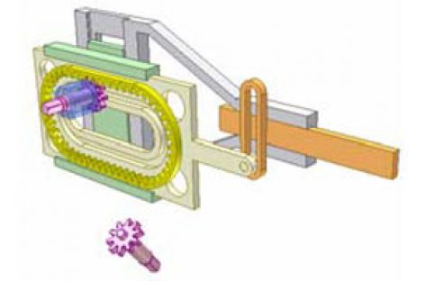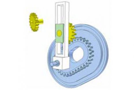 Bánh răng dẫn màu hồng, quay quanh trục di động của con trượt xanh, ăn khớp với bánh răng ô van màu vàng của tấm trượt lục. Tấm này chuyển động thẳng