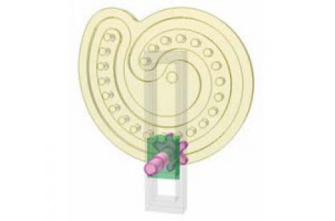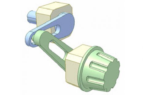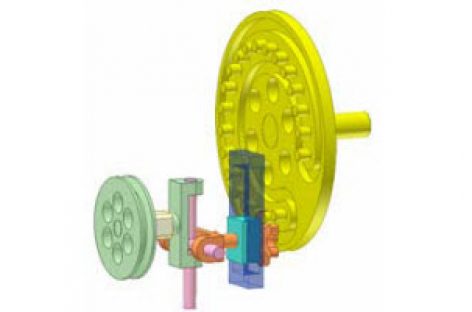 Bộ truyền bánh răng chốt. Khâu dẫn là bánh răng màu cam. Đầu cuối trục của nó trượt trong rãnh khép kín gồm các cung tròn của bánh chốt màu vàng.