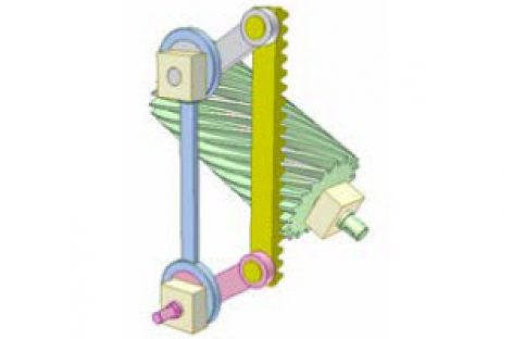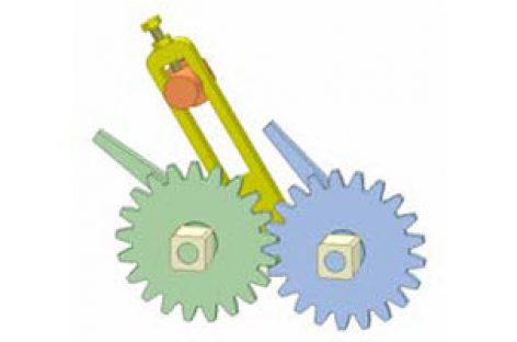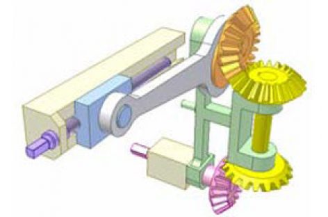 [Mô phỏng cơ cấu cơ khí] Cơ cấu hai cần lắc với bánh răng nón Hai cần lắc (xám và lục) lắc trong khi bánh răng dẫn màu hồng quay liên