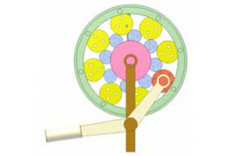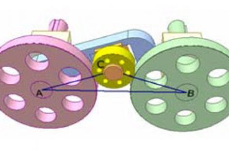 Bộ truyền bánh ma sát. Khâu dẫn: bánh màu hồng. Khâu bị dẫn: vành màu lục có rãnh lắp đai truyền. Hai bánh màu xanh quay lồng không, ổ của