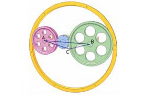 Bộ truyền bánh ma sát. Khâu dẫn: bánh màu hồng quay ngược chiều kim đồng hồ. Khâu bị dẫn: bánh màu lục. Vành màu cam tiếp xúc với hai bánh