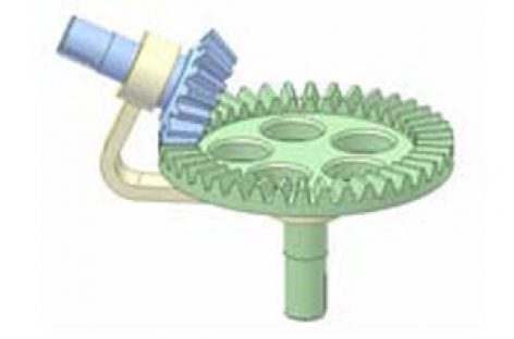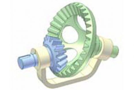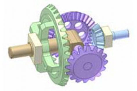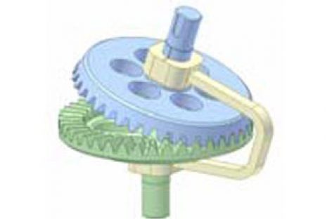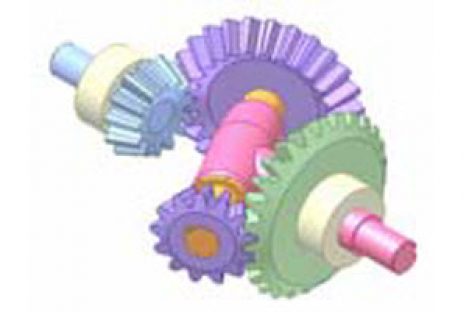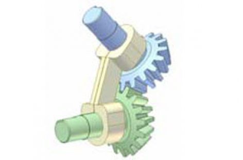 Bộ truyền hành tinh. Bánh răng lục cố định. Bánh răng hồng quay lồng không trên trục vàng. Trục bánh răng hồng không vuông góc với trục quay của trục