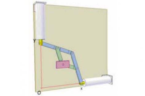 Vật màu hồng có 3 bậc tự do trong chuyển động phẳng: 2 tịnh tiến và 1 quay. Hai xy lanh trắng điều khiển hai chuyển động tịnh tiến qua cơ cấu