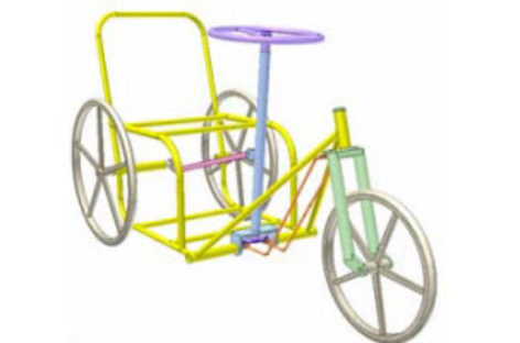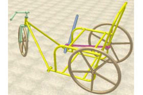 Xe chạy nhờ cơ cấu 4 khâu bản lề: tay lắc xanh, thanh truyền hồng và tay quay xám. Cách vượt qua vị trí chết khi bắt đầu đi: quay