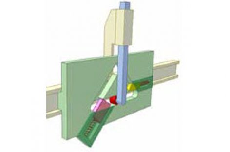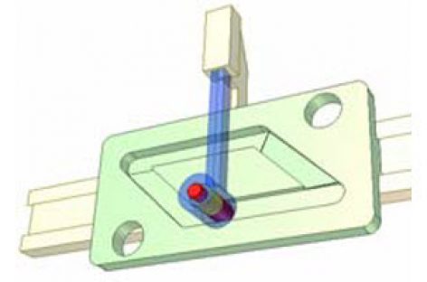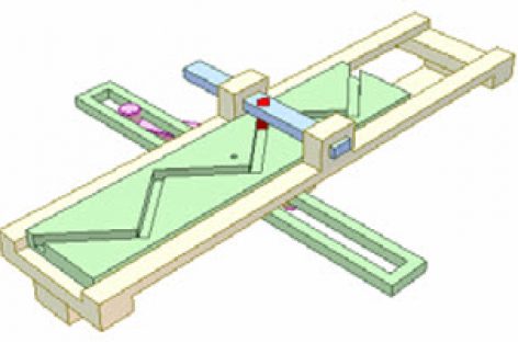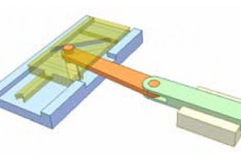 [Mô phỏng cơ cấu cơ khí] Stroke-multiplying mechanism Rãnh thứ hai ở đế màu xanh giúp tăng hành trình của con trượt bị dẫn màu vàng. Con trượt dẫn màu lục
