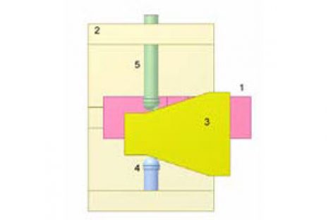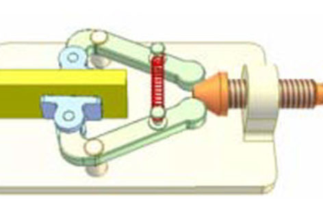 Đồ gá kẹp tự định tâm dùng cam tịnh tiến (đầu côn màu cam) để kẹp phôi vàng. Côn này chuyển động xoắn vít. Để xem các video khác về