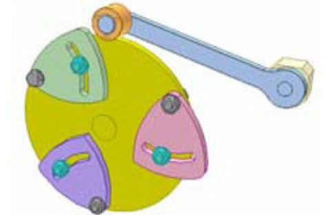 [Mô phỏng cơ cấu cơ khí] Cam ghép 2 Cam ghép gồm đĩa tròn màu vàng và một số cam tam giác. Chúng được kẹp với nhau nhờ bu lông xanh.