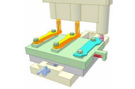 Dao đỏ được kẹp vào một đầu của thanh mang dao xanh và mũi dò hồng được kẹp vào đầu kia. Mũi dò chạy theo rãnh của cam mẫu vàng.