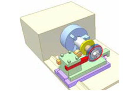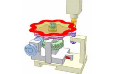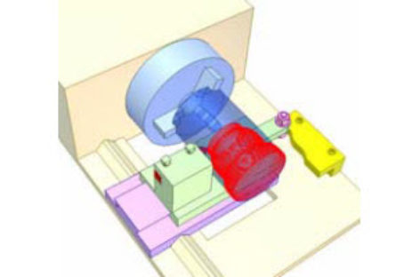 Bàn trượt màu xám mang bộ bánh vít trục vít (trong thực tế là bàn quay). Mẫu chép hình màu hồng và phôi vàng kẹp vào trục bánh vít. Mẫu