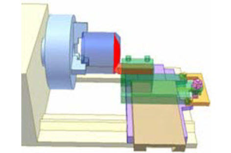 [Mô phỏng cơ cấu cơ khí] Chép hình trên máy tiện 2 Bàn dao ngang màu nâu chạy tự động vuông góc với trục quay của phôi xanh. Bàn dao