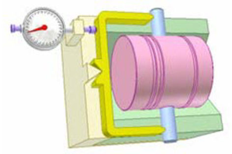 Lắp thanh tròn màu xanh vào lỗ của trục xám, bảo đảm không có khe hở. Đặt khối V và trục thẳng đứng. Sai số độ thẳng đứng không ảnh